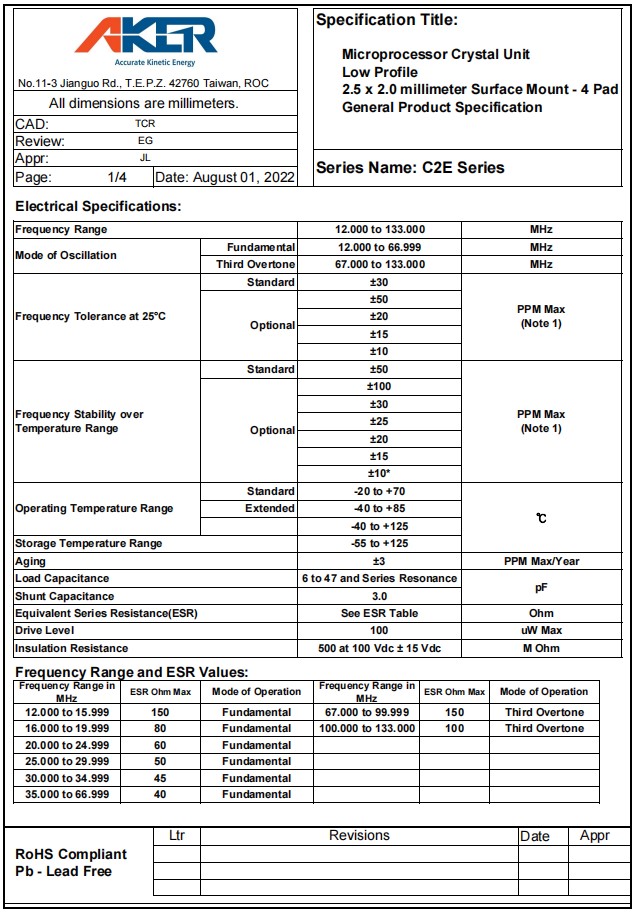 C2E-20.000-12-50100-X1-R | Aker晶振 | Crystal 20MHz ±50ppm (Tol) ±100ppm (Stability) 12pF FUND 100Ohm Automotive 4-Pin SMD T/R |