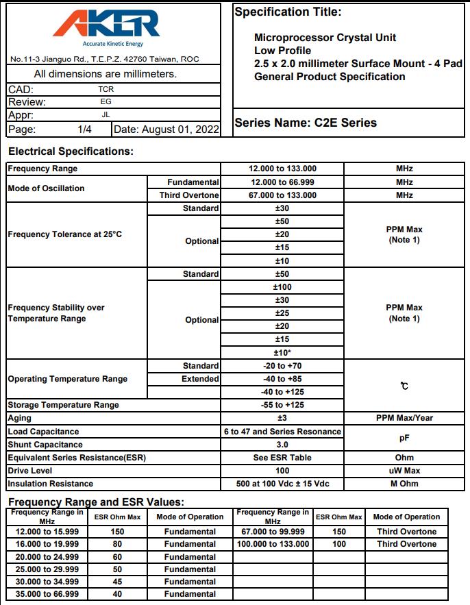 C2E-25.000-12-1520-R | Aker晶振 | Crystal 25MHz ±15ppm (Tol) ±20ppm (Stability) 12pF FUND 100Ohm Automotive 4-Pin SMD T/R |