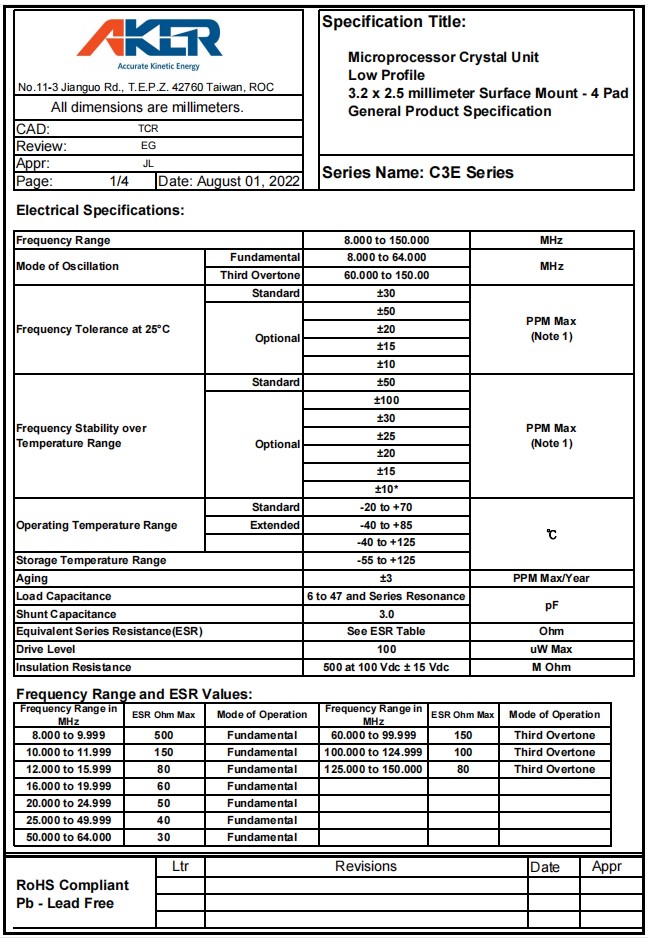 C3E-16.000-8-50100-X1-R | Aker晶振 | Crystal 16MHz ±50ppm (Tol) ±100ppm (Stability) 8pF FUND 100Ohm Automotive 4-Pin SMD T/R |