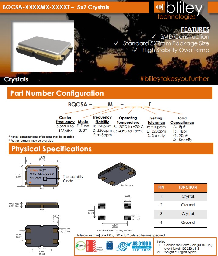 BQCSA-75MF-DCDGT,75MHz,7050mm,Bliley百利晶振,BQCSA,石英貼片晶振,參數(shù)表