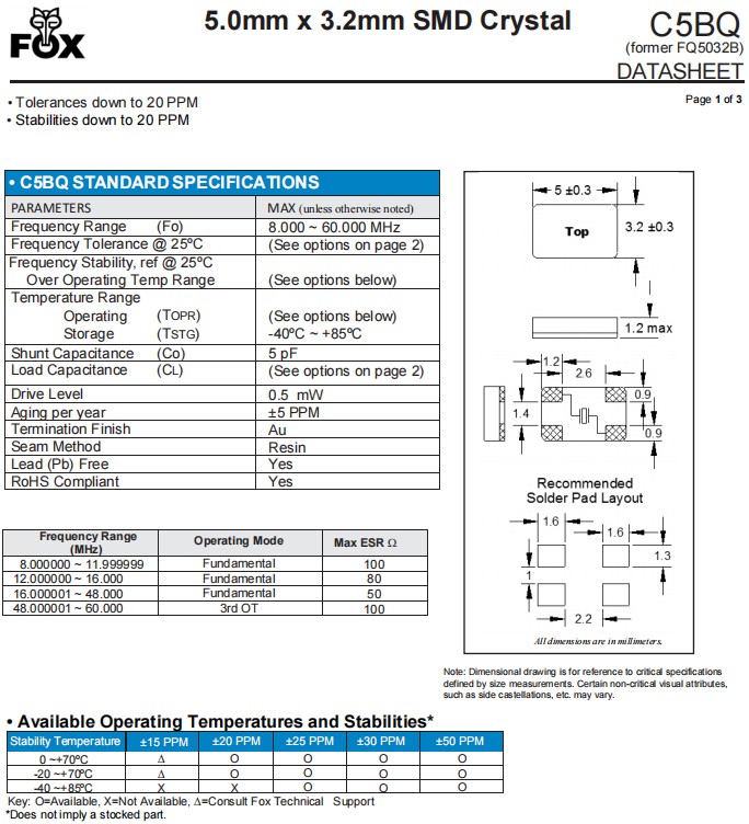 FQ5032BR-16.000 | Fox晶振 | C5BQ | 16MHz | ±50ppm |