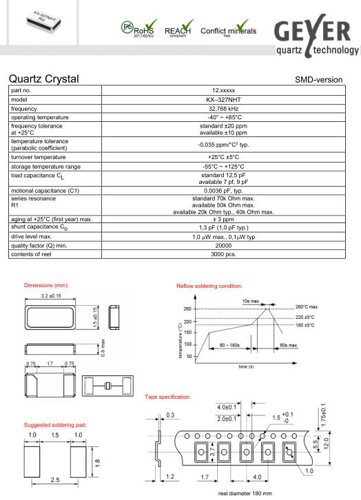 Geyer晶振,KX-327NHT晶振,環保晶振,32.768K時鐘晶體具有小型,薄型,輕型的貼片晶振表面音叉型晶體振蕩器,產品具有優良的耐熱性,耐環境特性,可發揮晶振優良的電氣特性,符合RoHS規定,滿足無鉛焊接的高溫回流溫度曲線要求,金屬外殼的封裝使得產品在封裝時能發揮比陶瓷振蕩器外殼更好的耐沖擊性.