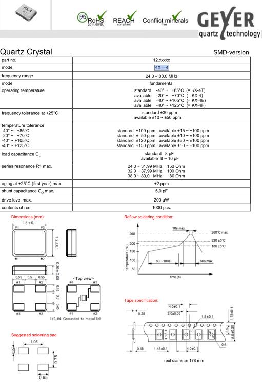 standard -40° ~ +85°C (= KX-4T) available -20° ~ +70°C (= KX-4) available -40° ~ +105°C (= KX-4E) available -40° ~ +125°C (= KX-4F) |