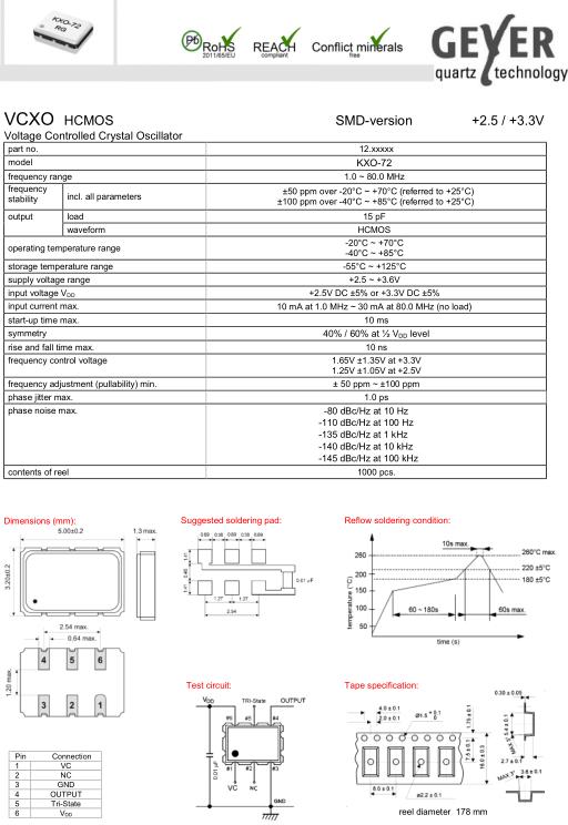 耶格晶振,KXO-72晶振,VCXO壓控晶振,5032mm體積的石英晶體振蕩器,有源晶振,該產品可驅動2.5V的溫補晶振,壓控晶振,VC-TCXO晶體振蕩器產品,電源電壓的低電耗型,編帶包裝方式,可對應自動高速貼片機自動焊接,及IR回流焊接(無鉛對應),為無鉛產品,超小型,質地輕.產品被廣泛應用到集成電路,程控交換系統,無線發射基站.