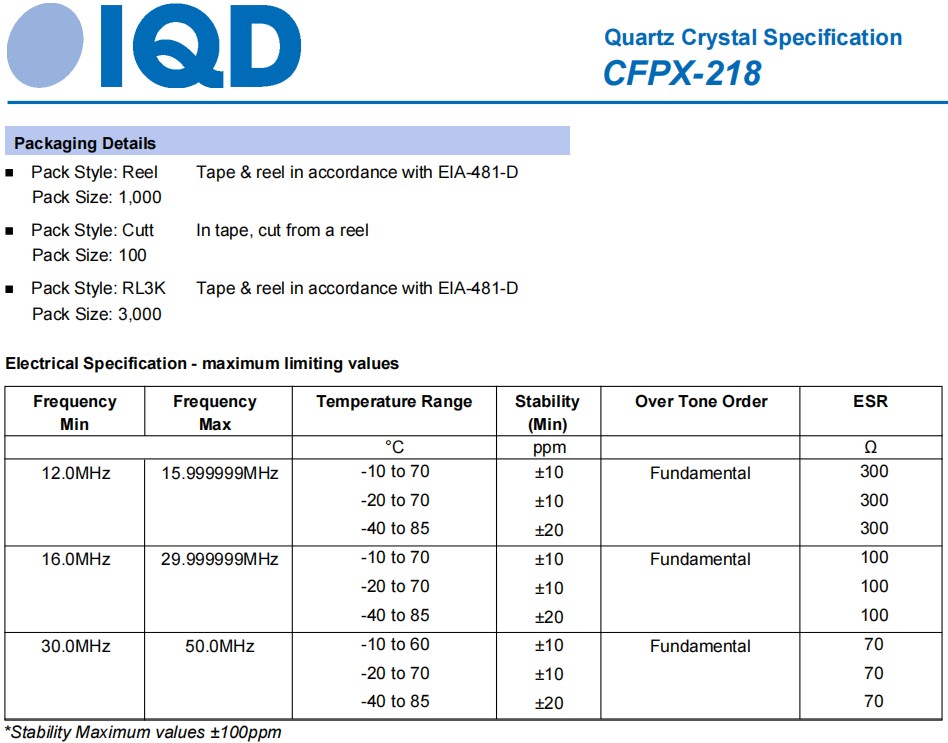 LFXTAL082084RL3K | IQD晶振 | CFPX-218 | CRYSTAL 10PF SURFACE MOUNT | - |