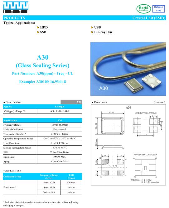 ITTI晶振,A30晶振,A30100-16.000-8晶振,超小型表面貼片型SMD晶振,最適合使用在汽車電子領域中,也是特別要求高可靠性的引擎控制用CPU的時鐘部分.低頻晶振可從7.98MHz起對應,小型,超薄型具備強防焊裂性,石英晶體在極端嚴酷的環境條件下也能發揮穩定的起振特性,產品本身具有耐熱,耐振,耐撞擊等優良的耐環境特性,滿足無鉛焊接以及高溫回流溫度曲線要求,符合AEC-Q200標準.