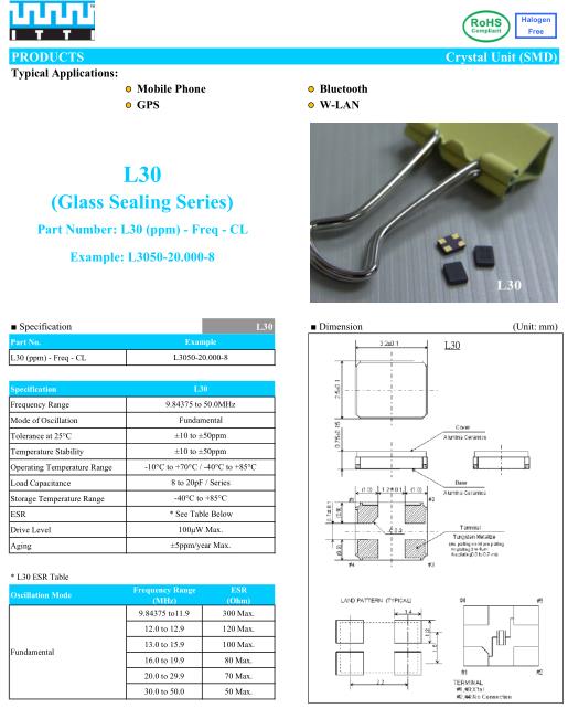 ITTI晶振,L30晶振,L3050-20.000-8晶振,小型貼片石英晶振,外觀尺寸具有薄型表面貼片型石英晶體振蕩器,特別適用于有小型化要求的市場(chǎng)領(lǐng)域,比如智能手機(jī),無(wú)線藍(lán)牙,平板電腦等電子數(shù)碼產(chǎn)品.晶振本身超小型,薄型,重量輕,晶體具有優(yōu)良的耐環(huán)境特性,如耐熱性,耐沖擊性,在辦公自動(dòng)化,家電相關(guān)電器領(lǐng)域及Bluetooth,WirelessLAN等短距離無(wú)線通信領(lǐng)域可發(fā)揮優(yōu)良的電氣特性,滿足無(wú)鉛焊接的回流溫度曲線要求.