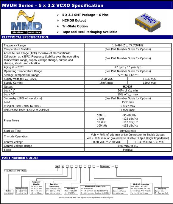 MMDCOMP晶振,MVUH晶振,MVUH-202048ADYR-16.000M-T晶振,5032mm體積的石英晶體振蕩器,有源晶振,該產品可驅動2.5V的溫補晶振,壓控晶振,VC-TCXO晶體振蕩器產品,電源電壓的低電耗型,編帶包裝方式,可對應自動高速貼片機自動焊接,及IR回流焊接(無鉛對應),為無鉛產品,超小型,質地輕.產品被廣泛應用到集成電路,程控交換系統,無線發射基站.