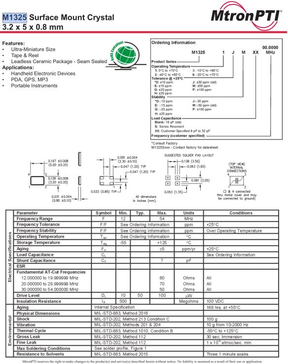 MtronPTI晶振,M1325晶振,M13251JMXX26.0000MHz晶振,智能手機(jī)晶振,產(chǎn)品具有高精度超小型的表面貼片型石英晶體振蕩器,最適用于移動(dòng)通信終端的基準(zhǔn)時(shí)鐘等移動(dòng)通信領(lǐng)域.比如智能手機(jī),無(wú)線通信,衛(wèi)星導(dǎo)航,平臺(tái)基站等較高端的數(shù)碼產(chǎn)品,晶振本身小型,薄型具備各類(lèi)移動(dòng)通信的基準(zhǔn)時(shí)鐘源用頻率,貼片晶振具有優(yōu)良的電氣特性,耐環(huán)境性能適用于移動(dòng)通信領(lǐng)域,滿(mǎn)足無(wú)鉛焊接的高溫回流溫度曲線要求.