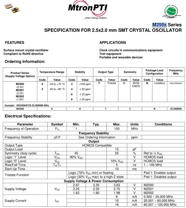 MtronPTI晶振,M250x晶振,M250064TCN24.000000MHz晶振,有源晶振,是指晶體本身起振需要外部電壓供應,起振后可直接驅動CMOS集成電路,產品本身已實現與薄型IC(TSSOP封裝,TVSOP封裝)同樣的1mm厚度,斷開時的消費電流是15µA以下,編帶包裝方式可對應自動搭載及IR回流焊接(無鉛對應)產品有幾種電壓供選1.8V,2.5V,3V3.3V,5V,以應對不同IC產品需要.