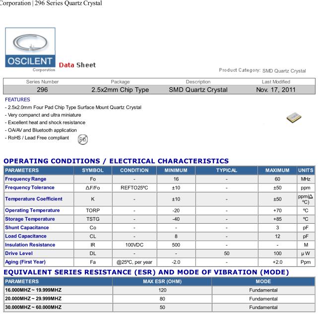 奧斯康利晶振,296-25.0M-9-20-G-S-TR晶振,SMD晶振,小型貼片石英晶振,外觀尺寸具有薄型表面貼片型石英晶體振蕩器,特別適用于有小型化要求的市場領域,比如智能手機,無線藍牙,平板電腦等電子數碼產品.晶振本身超小型,薄型,重量輕,晶體具有優良的耐環境特性,如耐熱性,耐沖擊性,在辦公自動化,家電相關電器領域及Bluetooth,WirelessLAN等短距離無線通信領域可發揮優良的電氣特性,滿足無鉛焊接的回流溫度曲線要求.
