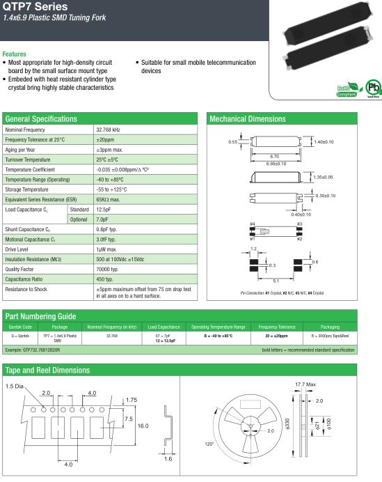 QANTEK晶振,QTP7晶振,QTP732.76812B20R晶振,貼片表晶32.768K系列具有超小型,薄型,質(zhì)地輕的表面貼片音叉型石英晶體振蕩器,晶振產(chǎn)品本身具備優(yōu)良的耐熱性,耐環(huán)境特性,在辦公自動化,家電領(lǐng)域,移動通信領(lǐng)域可發(fā)揮優(yōu)良的電氣特性,符合無鉛標準,滿足無鉛焊接的回流溫度曲線要求,金屬外殼的石英晶振使得產(chǎn)品在封裝時能發(fā)揮比陶瓷晶振外殼更好的耐沖擊性能.