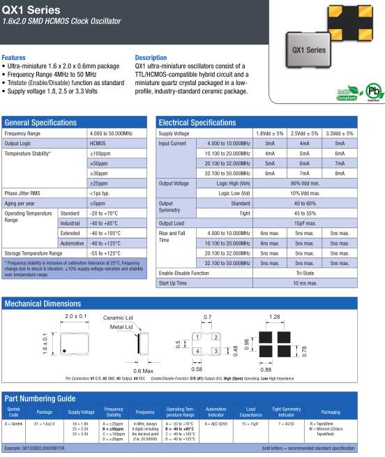 QANTEK晶振,QX1晶振,QX133B20.00000B15R晶振,小型SMD有源晶振,從最初超大體積到現在的7050mm,6035mm,5032mm,3225mm,2520mm體積,有著翻天覆地的改變,體積的變小也使產品帶來了更高的穩定性能,接縫密封石英晶體振蕩器,精度高,覆蓋頻率范圍寬的特點,SMD高速自動安裝和高溫回流焊設計,Optionable待機輸出三態輸出功能,電源電壓范圍:1.8V~5V,高穩定性,低抖動,低功耗,主要應用領域:無線通訊,高端智能手機,平板筆記本WLAN,藍牙,數碼相機,DSL和其他IT產品的晶振應用,三態功能,PC和LCDM等高端數碼領域,符合RoHS/無鉛.