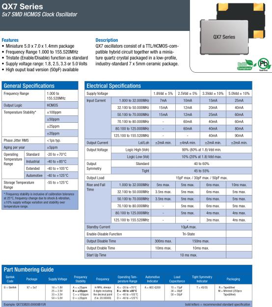QANTEK晶振,QX7晶振,QX733B20.00000B15R晶振,小型SMD有源晶振,從最初超大體積到現在的7050mm,6035mm,5032mm,3225mm,2520mm體積,有著翻天覆地的改變,體積的變小也使產品帶來了更高的穩定性能,接縫密封石英晶體振蕩器,精度高,覆蓋頻率范圍寬的特點,SMD高速自動安裝和高溫回流焊設計,Optionable待機輸出三態輸出功能,電源電壓范圍:1.8V~5V,高穩定性,低抖動,低功耗,主要應用領域:無線通訊,高端智能手機,平板筆記本WLAN,藍牙,數碼相機,DSL和其他IT產品的晶振應用,三態功能,PC和LCDM等高端數碼領域,符合RoHS/無鉛.