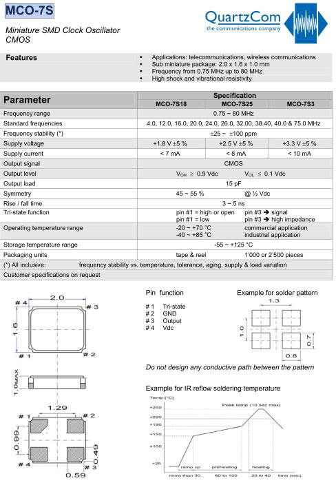 QuartzCom晶振,MCO-7S18晶振,SMD時(shí)鐘振蕩器,小型SMD有源晶振,從最初超大體積到現(xiàn)在的7050mm,6035mm,5032mm,3225mm,2520mm體積,有著翻天覆地的改變,體積的變小也使產(chǎn)品帶來(lái)了更高的穩(wěn)定性能,接縫密封石英晶體振蕩器,精度高,覆蓋頻率范圍寬的特點(diǎn),SMD高速自動(dòng)安裝和高溫回流焊設(shè)計(jì),Optionable待機(jī)輸出三態(tài)輸出功能,電源電壓范圍:1.8V~5V,高穩(wěn)定性,低抖動(dòng),低功耗,主要應(yīng)用領(lǐng)域:無(wú)線通訊,高端智能手機(jī),平板筆記本W(wǎng)LAN,藍(lán)牙,數(shù)碼相機(jī),DSL和其他IT產(chǎn)品的晶振應(yīng)用,三態(tài)功能,PC和LCDM等高端數(shù)碼領(lǐng)域,符合RoHS/無(wú)鉛.