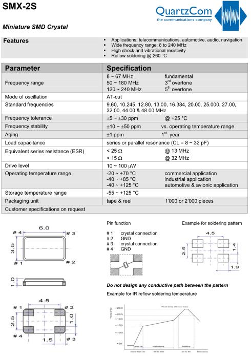 QuartzCom晶振,SMX-2S晶振,導航專用晶振,貼片晶振本身體積小,超薄型石英晶體振蕩器,特別適用于有目前高速發展的高端電子數碼產品,因為晶振本身小型化需求的市場領域,小型,薄型是對應陶瓷振蕩器(偏差大)和普通的石英晶體振蕩器(偏差小)的中間領域的一種性價比較出色的產品.產品廣泛用于筆記本電腦,無線電話,衛星導航SSD,USB,Blu-ray等用途,符合無鉛焊接的高溫回流焊曲線特性.