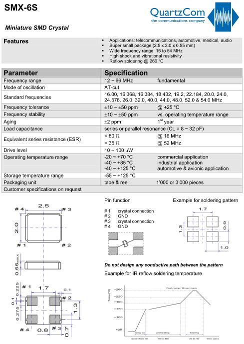 QuartzCom晶振,SMX-6S晶振,QuartzCom晶振代理商,小型貼片石英晶振,外觀尺寸具有薄型表面貼片型石英晶體振蕩器,特別適用于有小型化要求的市場領域,比如智能手機,無線藍牙,平板電腦等電子數碼產品.晶振本身超小型,薄型,重量輕,晶體具有優良的耐環境特性,如耐熱性,耐沖擊性,在辦公自動化,家電相關電器領域及Bluetooth,WirelessLAN等短距離無線通信領域可發揮優良的電氣特性,滿足無鉛焊接的回流溫度曲線要求.