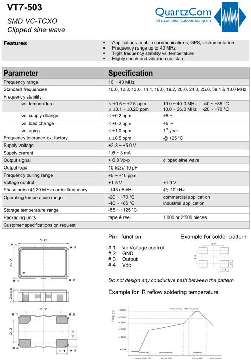 QuartzCom晶振,VT7-503晶振,SMD晶振,5032mm體積的石英晶體振蕩器,有源晶振,該產品可驅動2.5V的溫補晶振,壓控晶振,VC-TCXO晶體振蕩器產品,電源電壓的低電耗型,編帶包裝方式,可對應自動高速貼片機自動焊接,及IR回流焊接(無鉛對應),為無鉛產品,超小型,質地輕.產品被廣泛應用到集成電路,程控交換系統,無線發射基站.