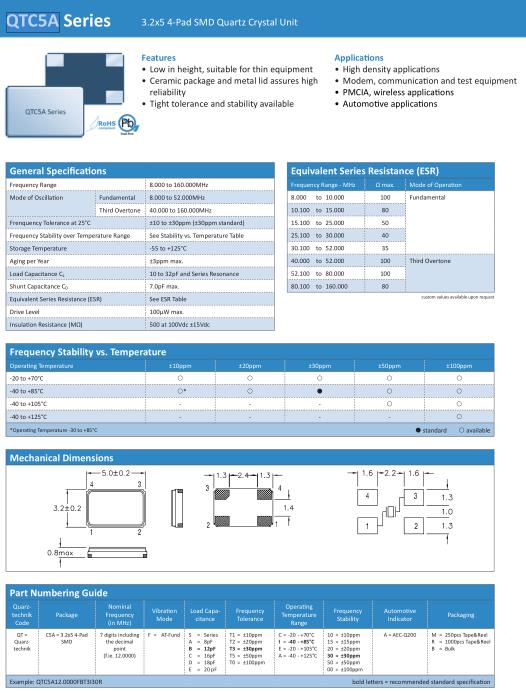 Quarztechnik晶振,QTC5A晶振,QTC5A12.0000FBT3I30R晶振,智能手機(jī)晶振,產(chǎn)品具有高精度超小型的表面貼片型石英晶體振蕩器,最適用于移動通信終端的基準(zhǔn)時鐘等移動通信領(lǐng)域.比如智能手機(jī),無線通信,衛(wèi)星導(dǎo)航,平臺基站等較高端的數(shù)碼產(chǎn)品,晶振本身小型,薄型具備各類移動通信的基準(zhǔn)時鐘源用頻率,貼片晶振具有優(yōu)良的電氣特性,耐環(huán)境性能適用于移動通信領(lǐng)域,滿足無鉛焊接的高溫回流溫度曲線要求.