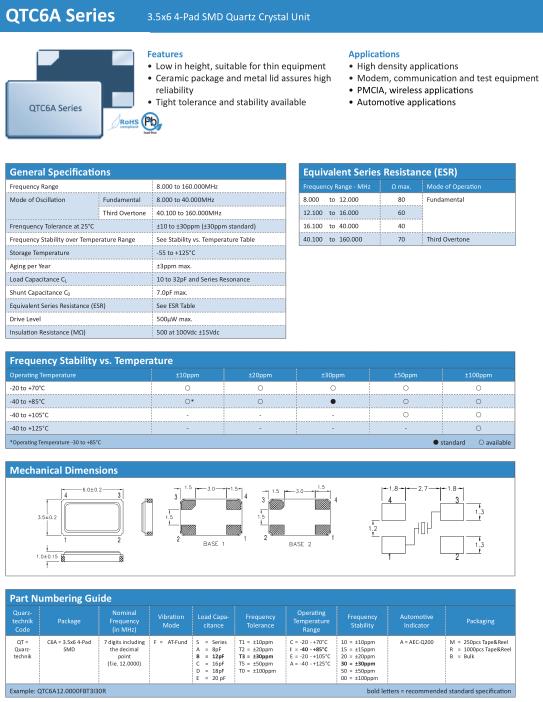 Quarztechnik晶振,QTC6A晶振,QTC6A12.0000FBT3I30R晶振,貼片晶振本身體積小,超薄型石英晶體振蕩器,特別適用于有目前高速發(fā)展的高端電子數(shù)碼產(chǎn)品,因為晶振本身小型化需求的市場領(lǐng)域,小型,薄型是對應陶瓷振蕩器(偏差大)和普通的石英晶體振蕩器(偏差小)的中間領(lǐng)域的一種性價比較出色的產(chǎn)品.產(chǎn)品廣泛用于筆記本電腦,無線電話,衛(wèi)星導航SSD,USB,Blu-ray等用途,符合無鉛焊接的高溫回流焊曲線特性.