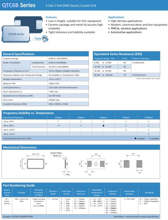 Quarztechnik晶振,QTC6B晶振,QTC6B20.0000FBT3I30R晶振,貼片晶振本身體積小,超薄型石英晶體振蕩器,特別適用于有目前高速發(fā)展的高端電子數(shù)碼產(chǎn)品,因?yàn)榫д癖旧硇⌒突枨蟮氖袌鲱I(lǐng)域,小型,薄型是對應(yīng)陶瓷振蕩器(偏差大)和普通的石英晶體振蕩器(偏差小)的中間領(lǐng)域的一種性價比較出色的產(chǎn)品.產(chǎn)品廣泛用于筆記本電腦,無線電話,衛(wèi)星導(dǎo)航SSD,USB,Blu-ray等用途,符合無鉛焊接的高溫回流焊曲線特性.