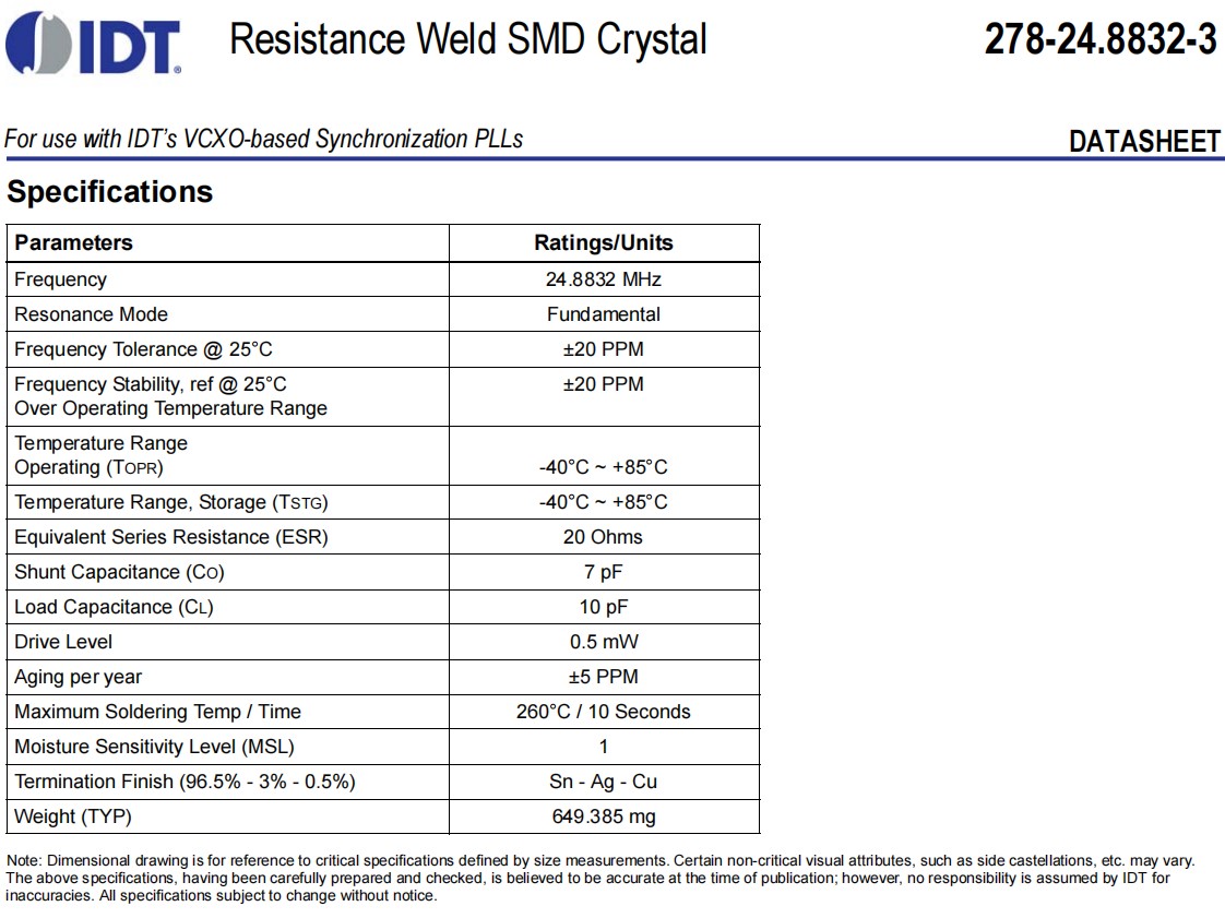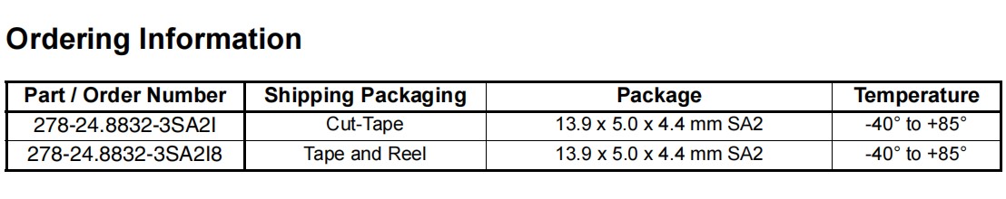 Renesas石英貼片晶振,278-24.8832-3SA2I,物聯(lián)網(wǎng)6G晶振,參數(shù)表