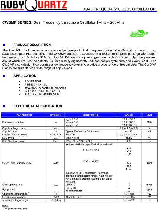 Rubyquartz晶振,CWSMF晶振,CWSMF243TSH0-12.000晶振,5032mm體積的石英晶體振蕩器,有源晶振,該產品可驅動2.5V的溫補晶振,壓控晶振,VC-TCXO晶體振蕩器產品,電源電壓的低電耗型,編帶包裝方式,可對應自動高速貼片機自動焊接,及IR回流焊接(無鉛對應),為無鉛產品,超小型,質地輕.產品被廣泛應用到集成電路,程控交換系統,無線發射基站.