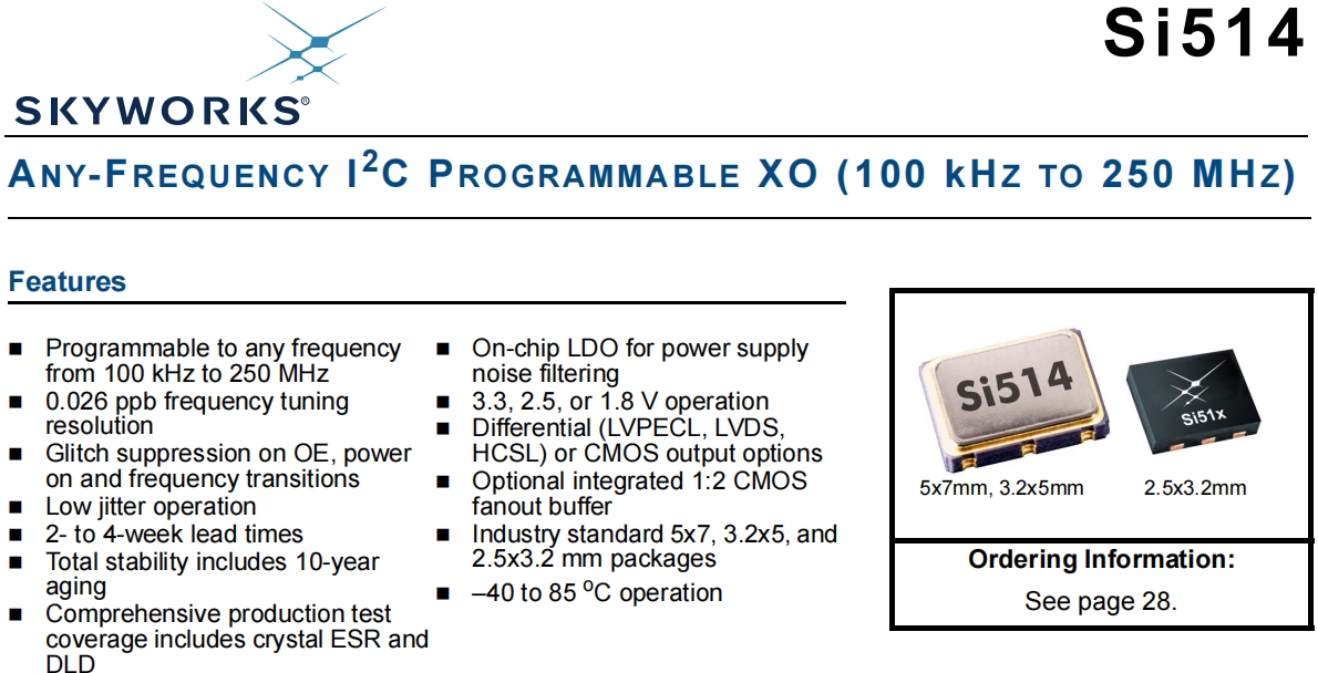 514JBA001011CAGR | Skyworks有源晶振 | DIFFERENTIAL/SINGLE-ENDED; I2C P | Si514 | 148.5 MHz | LVDS |