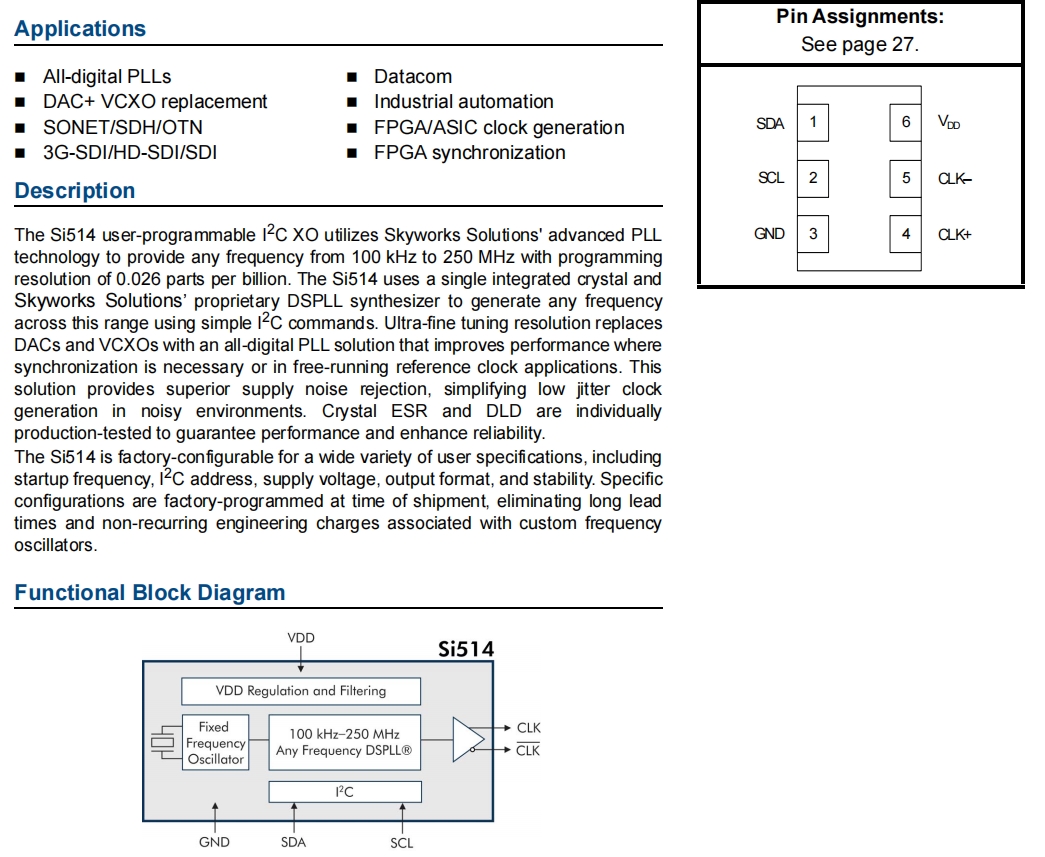 514BBA000290BAGR | Skyworks有源晶振 | DIFFERENTIAL/SINGLE-ENDED; I2C P | Si514 | 250 MHz | LVDS |