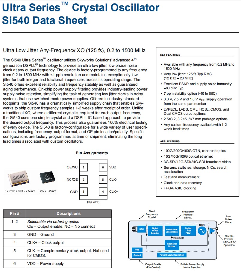 540BCA70M6560BCG | Skyworks晶振 | Si540 | 70.656 MHz | LVDS | 1.8V, 2.5V, 3.3V |