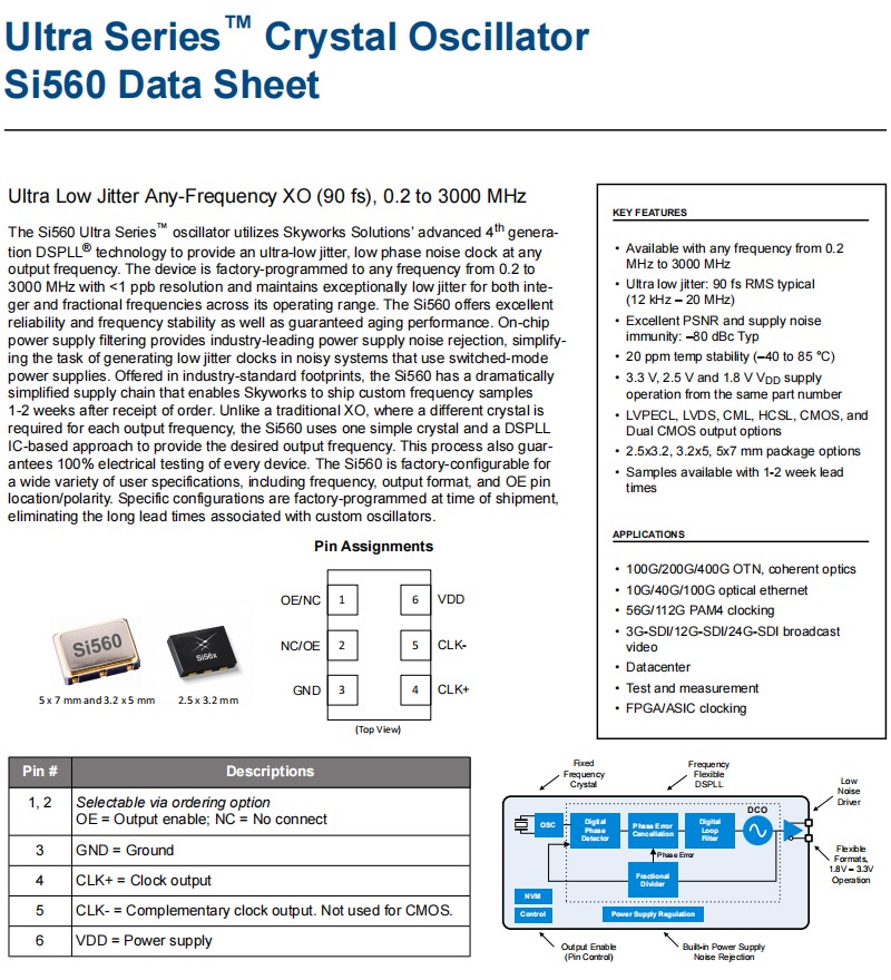 Skyworks差分晶振,560BAA125M000BCG,Si560路由器晶振,Skyworks思佳訊晶振,美國進口晶振,型號:Si560,編碼為:560BAA125M000BCG,頻率為:125.000MHz,小體積晶振尺寸:5.0x3.2mm封裝,LVDS輸出差分晶振,六腳貼片晶振,石英晶振,有源晶振,差分晶體振蕩器,超低抖動任意頻率XO(90 fs),具有超小型,輕薄型,低抖動,低功耗,低相位噪聲,低電源電壓,低耗能,低電平等特點。應用于:100G/200G/400G OTN,相干光學,10G/40G/100G光學以太網,56G/112G PAM4時鐘,3G-SDI/12G-SDI/24G-SDI廣播視頻,數據中心,測試和測量,FPGA/ASIC時鐘。