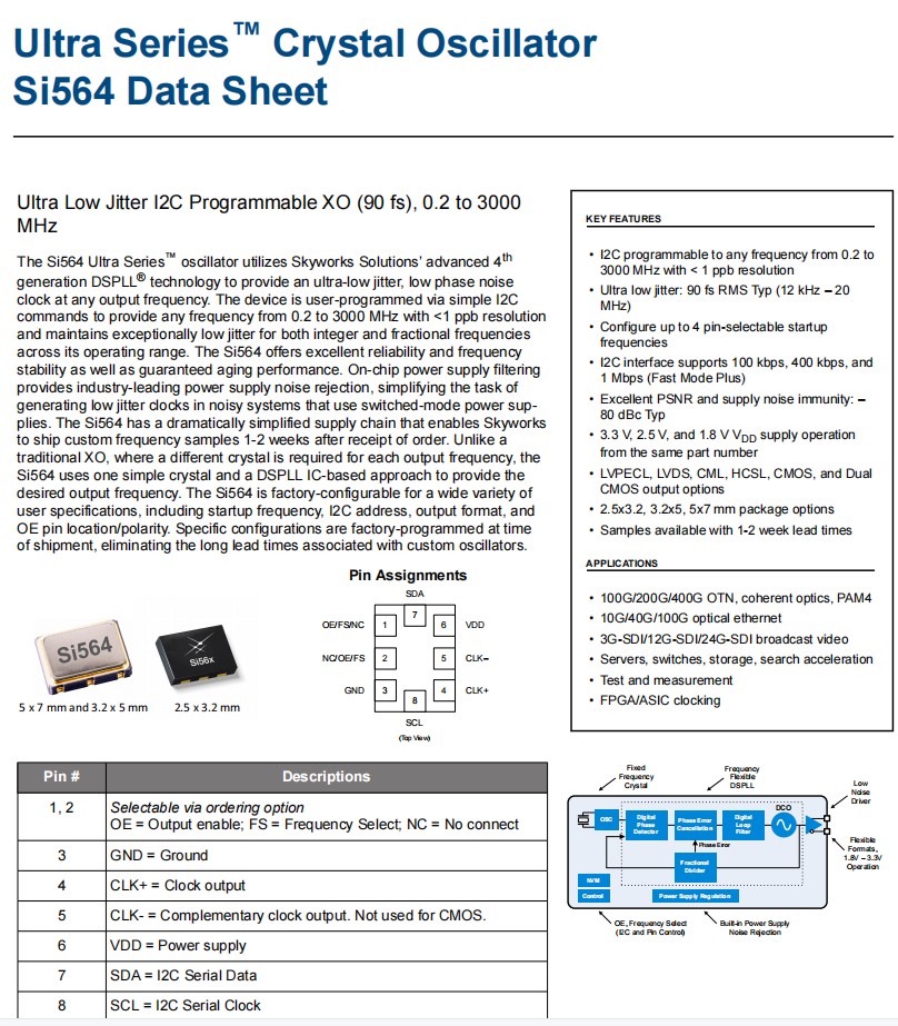 思佳訊LVPECL晶振,564AAAC000118BCG,Si564光纖通訊晶振,進口晶振,Skyworks思佳訊晶振,型號:Si564,編碼為:564AAAC000118BCG,頻率為:156.25MHz,小體積晶振尺寸:5.0x3.2mm封裝,8墊腳貼片晶振,LVPECL輸出差分晶振,石英晶振,有源晶振,差分晶體振蕩器。具有超小型,輕薄型,低抖動,低功耗,低相位噪聲,低電源電壓,低耗能等特點。應用于:通訊設備,光模塊,以太網,3G-SDI/12G-SDI/24G-SDI廣播視頻,服務器、交換機、存儲、搜索加速,測試和測量,FPGA/ASIC時鐘,物聯網,無線網絡,光纖通道等應用。