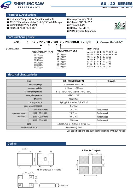 Shinsung晶振,SX-22晶振,SX-22-10-20HZ-20.000MHz-9pF晶振,小型貼片石英晶振,外觀尺寸具有薄型表面貼片型石英晶體振蕩器,特別適用于有小型化要求的市場領域,比如智能手機,無線藍牙,平板電腦等電子數碼產品.晶振本身超小型,薄型,重量輕,晶體具有優良的耐環境特性,如耐熱性,耐沖擊性,在辦公自動化,家電相關電器領域及Bluetooth,WirelessLAN等短距離無線通信領域可發揮優良的電氣特性,滿足無鉛焊接的回流溫度曲線要求.