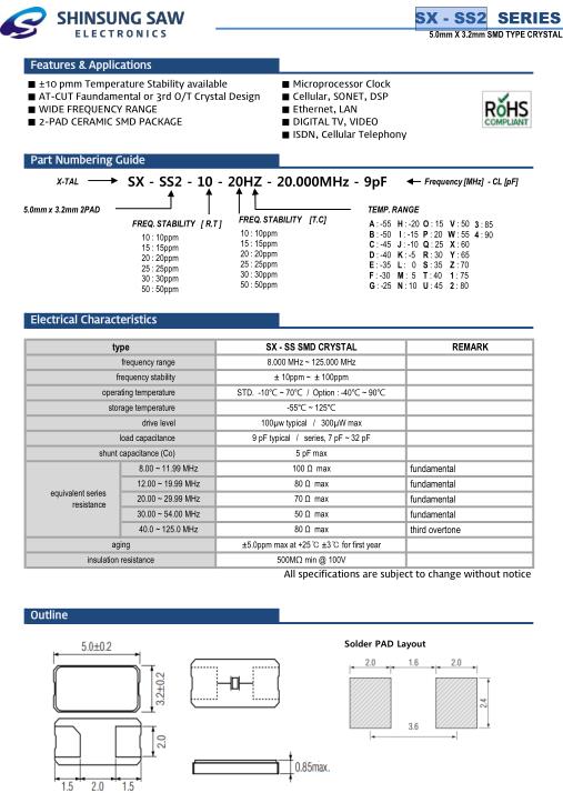 Shinsung晶振,SX-SS2晶振,SX-SS2-10-20HZ-20.000MHz-8pF晶振,智能手機晶振,產品具有高精度超小型的表面貼片型石英晶體振蕩器,最適用于移動通信終端的基準時鐘等移動通信領域.比如智能手機,無線通信,衛星導航,平臺基站等較高端的數碼產品,晶振本身小型,薄型具備各類移動通信的基準時鐘源用頻率,貼片晶振具有優良的電氣特性,耐環境性能適用于移動通信領域,滿足無鉛焊接的高溫回流溫度曲線要求.