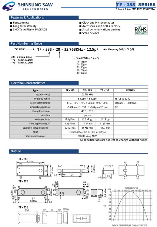 Shinsung晶振,TF-17S晶振,TF-17S-20-32.768KHz-12pF晶振,貼片表晶32.768K系列具有超小型,薄型,質地輕的表面貼片音叉型石英晶體振蕩器,晶振產品本身具備優良的耐熱性,耐環境特性,在辦公自動化,家電領域,移動通信領域可發揮優良的電氣特性,符合無鉛標準,滿足無鉛焊接的回流溫度曲線要求,金屬外殼的石英晶振使得產品在封裝時能發揮比陶瓷晶振外殼更好的耐沖擊性能.