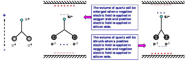 石英材料中的二氧化硅分子(SiO2) 在正常狀態(tài)下, 其電偶極是互相平衡的電中性. 在(如上圖)的二氧化硅是以二維空間的簡(jiǎn)化圖形. 當(dāng)我們?cè)诠柙由戏郊把踉酉路椒謩e給予正電場(chǎng)及負(fù)電場(chǎng)時(shí), 空間系統(tǒng)為了維持電位平衡, 兩個(gè)氧原子會(huì)相互排斥, 在氧原子下方形成一個(gè)感應(yīng)正電場(chǎng)區(qū)域, 同時(shí)在硅原子上方產(chǎn)生感應(yīng)負(fù)電場(chǎng)區(qū)域. 相反的情況, 當(dāng)我們?cè)诠柙由戏郊把踉酉路椒謩e給予負(fù)電場(chǎng)及正電場(chǎng)時(shí), 兩個(gè)氧原子會(huì)相互靠近, 氧原子下方產(chǎn)生感應(yīng)負(fù)電場(chǎng),硅原子上方產(chǎn)生感應(yīng)正電場(chǎng).