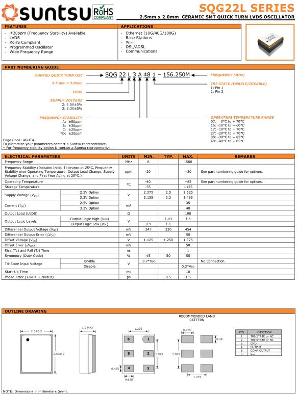Suntsu晶振,SQG22L晶振,SQG22L3A481-8.000M晶振,有源晶振,是指晶體本身起振需要外部電壓供應(yīng),起振后可直接驅(qū)動(dòng)CMOS集成電路,產(chǎn)品本身已實(shí)現(xiàn)與薄型IC(TSSOP封裝,TVSOP封裝)同樣的1mm厚度,斷開(kāi)時(shí)的消費(fèi)電流是15µA以下,編帶包裝方式可對(duì)應(yīng)自動(dòng)搭載及IR回流焊接(無(wú)鉛對(duì)應(yīng))產(chǎn)品有幾種電壓供選1.8V,2.5V,3V3.3V,5V,以應(yīng)對(duì)不同IC產(chǎn)品需要.