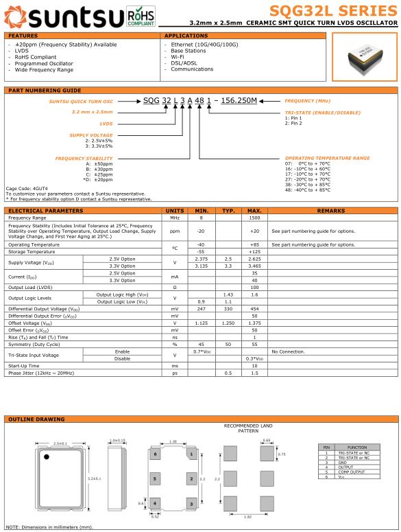Suntsu晶振,SQG32L晶振,SQG32L3A481-12.000M晶振,小型SMD有源晶振,從最初超大體積到現在的7050mm,6035mm,5032mm,3225mm,2520mm體積,有著翻天覆地的改變,體積的變小也使產品帶來了更高的穩定性能,接縫密封石英晶體振蕩器,精度高,覆蓋頻率范圍寬的特點,SMD高速自動安裝和高溫回流焊設計,Optionable待機輸出三態輸出功能,電源電壓范圍:1.8V~5V,高穩定性,低抖動,低功耗,主要應用領域:無線通訊,高端智能手機,平板筆記本WLAN,藍牙,數碼相機,DSL和其他IT產品的晶振應用,三態功能,PC和LCDM等高端數碼領域,符合RoHS/無鉛.