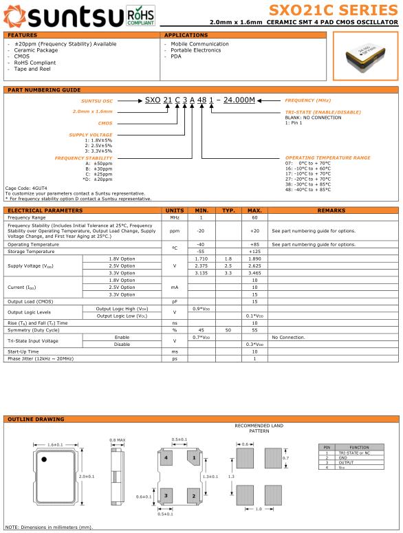 松圖晶振,SXO21C晶振,SXO21C3A481-24.000M晶振,貼片式石英晶體振蕩器,低電壓啟動功率,并且有多種電壓供選擇,比如有1.8V,2.5V,3.3V,3.8V,5V等,產(chǎn)品被廣泛應(yīng)用于,平板筆記本,GPS系統(tǒng),光纖通道,千兆以太網(wǎng),串行ATA,串行連接SCSI,PCI-Express的SDH/SONET發(fā)射基站等領(lǐng)域.符合RoHS/無鉛.