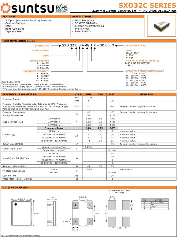 Suntsu晶振,SXO32C晶振,SXO32C3A481X-24.000M晶振,小型SMD有源晶振,從最初超大體積到現在的7050mm,6035mm,5032mm,3225mm,2520mm體積,有著翻天覆地的改變,體積的變小也使產品帶來了更高的穩定性能,接縫密封石英晶體振蕩器,精度高,覆蓋頻率范圍寬的特點,SMD高速自動安裝和高溫回流焊設計,Optionable待機輸出三態輸出功能,電源電壓范圍:1.8V~5V,高穩定性,低抖動,低功耗,主要應用領域:無線通訊,高端智能手機,平板筆記本WLAN,藍牙,數碼相機,DSL和其他IT產品的晶振應用,三態功能,PC和LCDM等高端數碼領域,符合RoHS/無鉛.