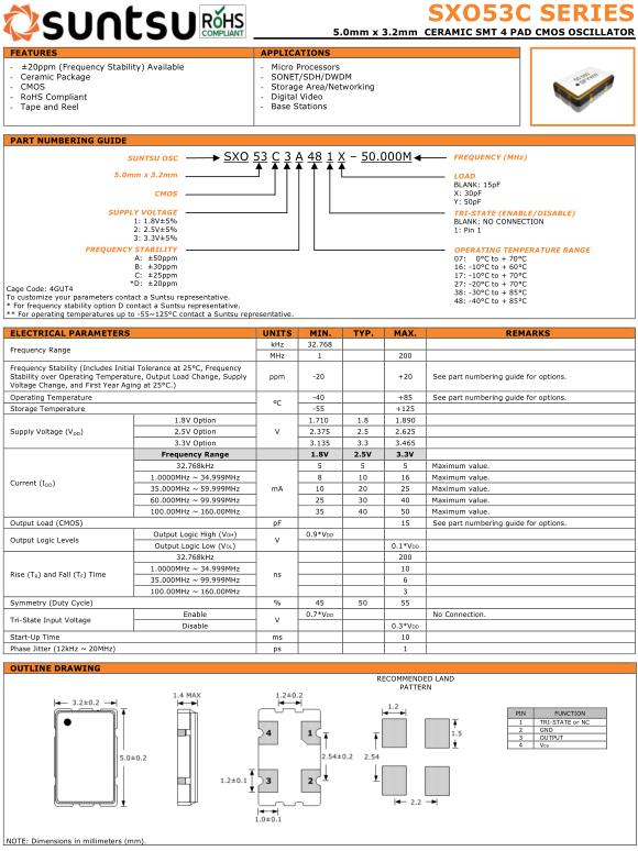 松圖晶振,SXO53C晶振,SXO53C3A481X-20.000M晶振,5032mm體積的石英晶體振蕩器,有源晶振,該產(chǎn)品可驅(qū)動2.5V的溫補晶振,壓控晶振,VC-TCXO晶體振蕩器產(chǎn)品,電源電壓的低電耗型,編帶包裝方式,可對應自動高速貼片機自動焊接,及IR回流焊接(無鉛對應),為無鉛產(chǎn)品,超小型,質(zhì)地輕.產(chǎn)品被廣泛應用到集成電路,程控交換系統(tǒng),無線發(fā)射基站.