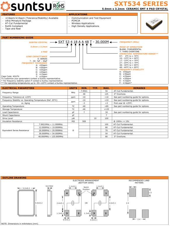 Suntsu晶振,SXT534晶振,SXT53418AA48T-20.000M晶振,小型表面貼片晶振型,是標準的石英晶體振蕩器,適用于寬溫范圍的電子數碼產品,家電電器及MP3,MP4,播放器,單片機等領域.可對應8.000MHz以上的頻率,在電子數碼產品,以及家電相關電器領域里面發揮優良的電氣特性,滿足無鉛焊接的回流溫度曲線要求..