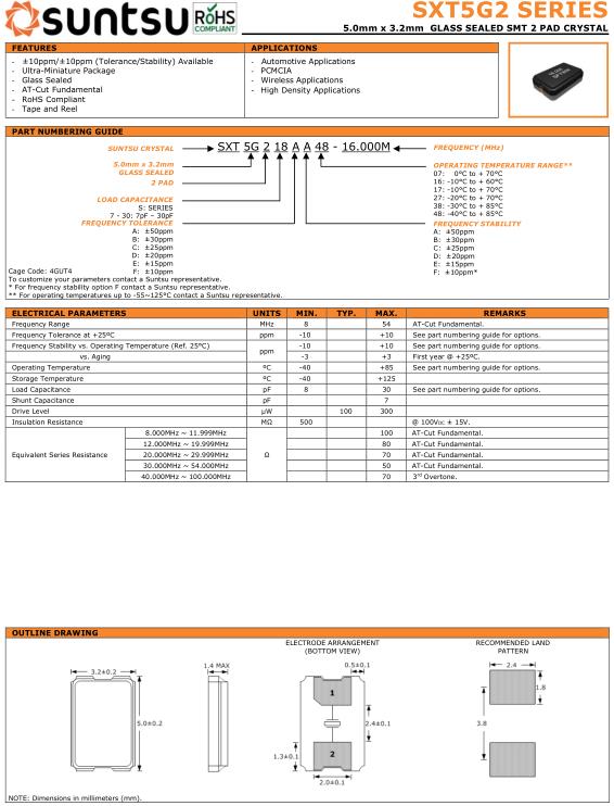 美國Suntsu晶振公司成立于2002年,是新生代頻率元器件廠商.suntsu Crystal也稱松圖晶振,總部位于美國加利福尼亞奧蘭治縣.與中韓臺合資成立.并專注于有源晶振,石英晶體振蕩器,SMD晶振等元件.Suntsu晶振,SXT5G2晶振,SXT5G218AA48-16.000M晶振.