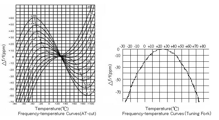 頻率穩定性與溫度 隨著溫度的變化,所有晶振的共振頻率都不同.頻率變化的方式取決于切割晶體的角度.AT切割石英晶振的相對頻移與溫度的關系可以表示為三次多項式.
