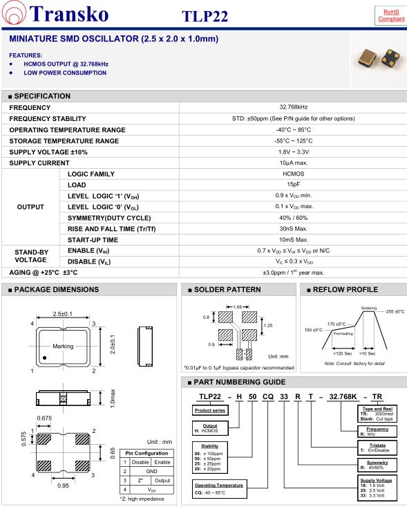 Transko晶振,TG32晶振,TG32-L50HM33T1-26.000M-TR晶振,貼片表晶32.768K系列具有超小型,薄型,質地輕的表面貼片音叉型石英晶體振蕩器,晶振產品本身具備優良的耐熱性,耐環境特性,在辦公自動化,家電領域,移動通信領域可發揮優良的電氣特性,符合無鉛標準,滿足無鉛焊接的回流溫度曲線要求,金屬外殼的石英晶振使得產品在封裝時能發揮比陶瓷晶振外殼更好的耐沖擊性能.