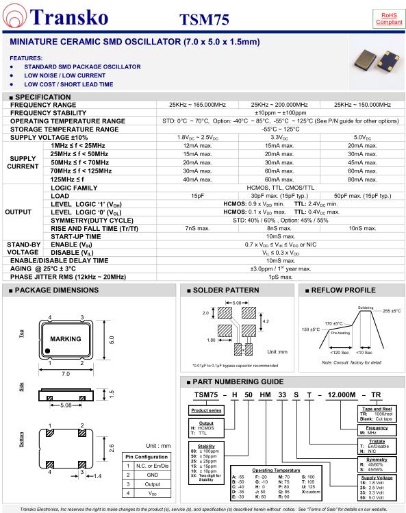 Transko晶振,TSM75晶振,TSM75-H50HM33ST-12.000-TR晶振,小型SMD有源晶振,從最初超大體積到現(xiàn)在的7050mm,6035mm,5032mm,3225mm,2520mm體積,有著翻天覆地的改變,體積的變小也使產(chǎn)品帶來了更高的穩(wěn)定性能,接縫密封石英晶體振蕩器,精度高,覆蓋頻率范圍寬的特點(diǎn),SMD高速自動(dòng)安裝和高溫回流焊設(shè)計(jì),Optionable待機(jī)輸出三態(tài)輸出功能,電源電壓范圍:1.8V~5V,高穩(wěn)定性,低抖動(dòng),低功耗,主要應(yīng)用領(lǐng)域:無線通訊,高端智能手機(jī),平板筆記本W(wǎng)LAN,藍(lán)牙,數(shù)碼相機(jī),DSL和其他IT產(chǎn)品的晶振應(yīng)用,三態(tài)功能,PC和LCDM等高端數(shù)碼領(lǐng)域,符合RoHS/無鉛.