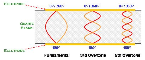 在AT切割角度的石英晶體共振子主要是以厚度剪切振蕩模態存在. 石英晶體在共振時, 除了基本波振蕩之外, 高階的倍頻共振也與基本波振蕩同時存在于石英晶體的電極區域之間. 但是, 由于壓電材料的電極是電氣相位相反的振動環境, 所以, 祇有奇數倍(odd number)的高頻倍頻可以發生, 偶數倍(even number)的倍頻共振在石英晶體共振子是不會存在的(如圖).