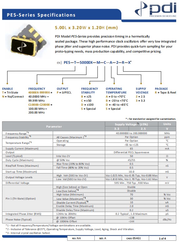 威爾威LVPECL晶振,PE5-T-C10000-M-B-D-2-R-X,低相位噪聲晶振,參數表
