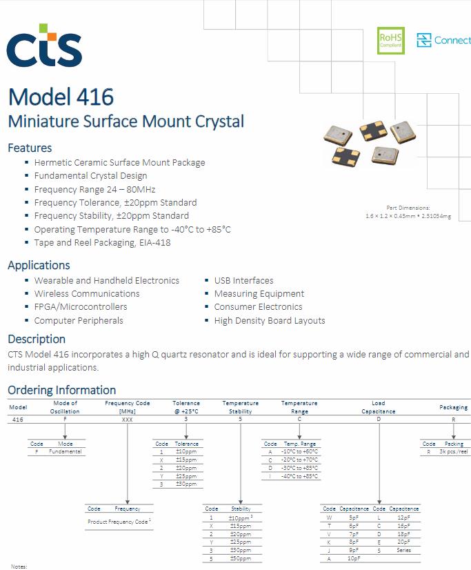 416F40613CSR | CTS晶振 | 416 | MHz Crystal | 40.61MHz |