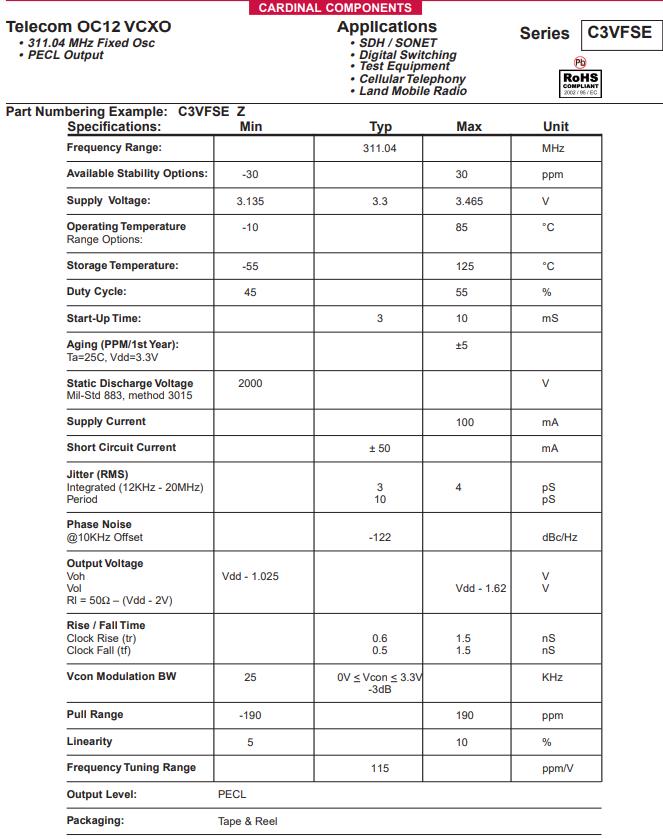 C3VFSE7 | Cardinal | OSC VCXO 311.04MHZ PECL SMD | VCXO | 311.04MHz | PECL | ±30ppm | -10°C ~ 85°C |